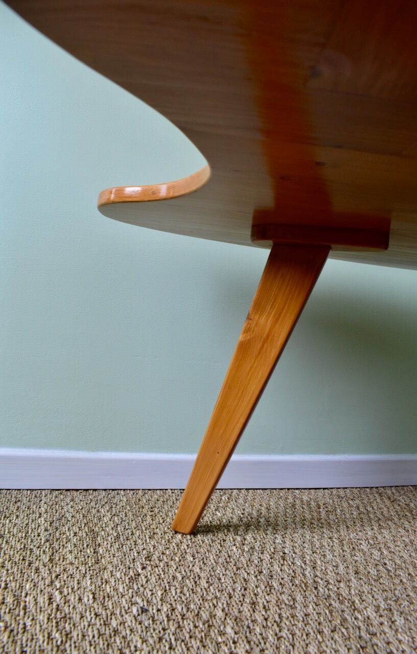 This coffee table with a herringbone pattern and legs highlighting and featuring the plywood layers.